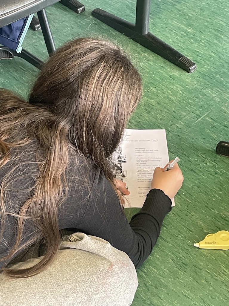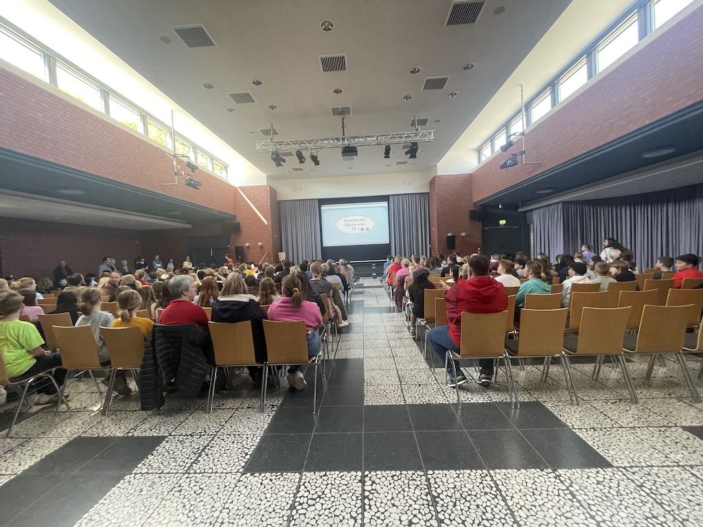 Dabei wurden auch die eigene Klassengemeinschaft und die Rolle jedes Einzelnen darin beleuchtet und viele neue Impulse und Ideen zum gemeinsamen Miteinander gewonnen. Unter dem Motto „Gemeinsam Klasse sein“ lernten die Schülerinnen und Schüler, wie wichtig respektvoller Umgang miteinander ist und wie man Konflikte friedlich lösen kann. In verschiedenen Gruppenarbeiten, Gesprächen und kreativen Aufgaben setzten sich die Klassen damit auseinander, was Mobbing eigentlich bedeutet, welche Folgen es für Betroffene haben kann und wie man helfen kann. Auch das Thema Cybermobbing spielte eine große Rolle. Die Schülerinnen und Schüler erfuhren, wie Worte verletzen können, wie schnell sich solche Worte oder -noch schlimmer- Bilder und Videos im Netz verbreiten können und warum ein verantwortungsvoller Umgang mit digitalen Medien so wichtig ist. Zum Abschluss der Projekttage waren alle Eltern eingeladen, zunächst gemeinsam in der Aula, dann in den jeweiligen Klassen mehr über die Tage zu erfahren, die Ergebnisse und Plakate, die in der Zeit entstanden sind, zu bestaunen und Fragen zu stellen. Das Interesse war riesig, teilweise kamen ganze Familien mit Geschwisterkindern und hörten den kurzen Vorträgen der Fünftklässler/innen aufmerksam zu.