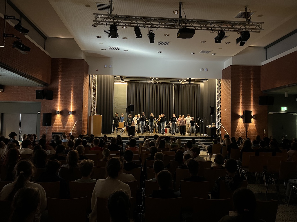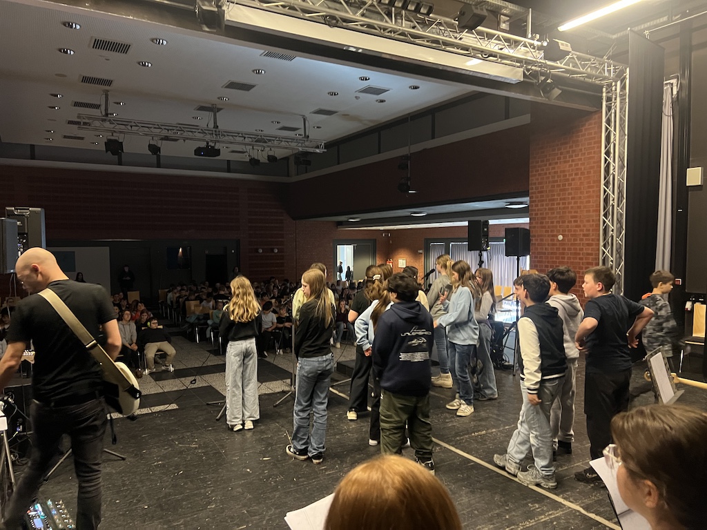 Unter der Leitung der Musiklehrkräfte Herrn Northoff, Frau Leeners und Frau Thering hatten die Klassen in den vergangenen Musikstunden ihre jeweiligen Songs eingeübt und intensiv geprobt. Die Mühe zahlte sich aus: In der Aula herrschte während des gesamten Konzerts eine großartige Stimmung, und das Publikum erlebte zwei unterhaltsame und musikalisch vielfältige Stunden. Beim gemeinsamen Abschlusssong war die Begeisterung schließlich so groß, dass viele nicht mehr auf ihren Stühlen sitzen bleiben konnten und fröhlich mitmachten. Wir freuen uns schon auf das nächste Schülerkonzert!