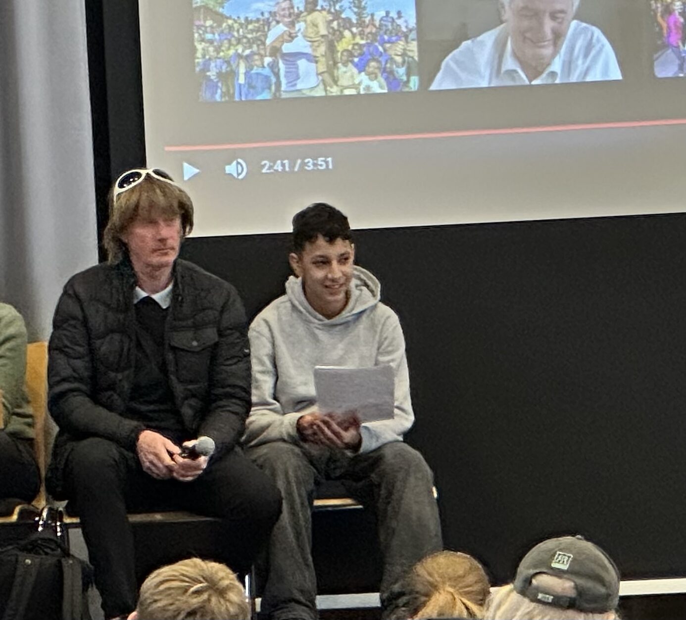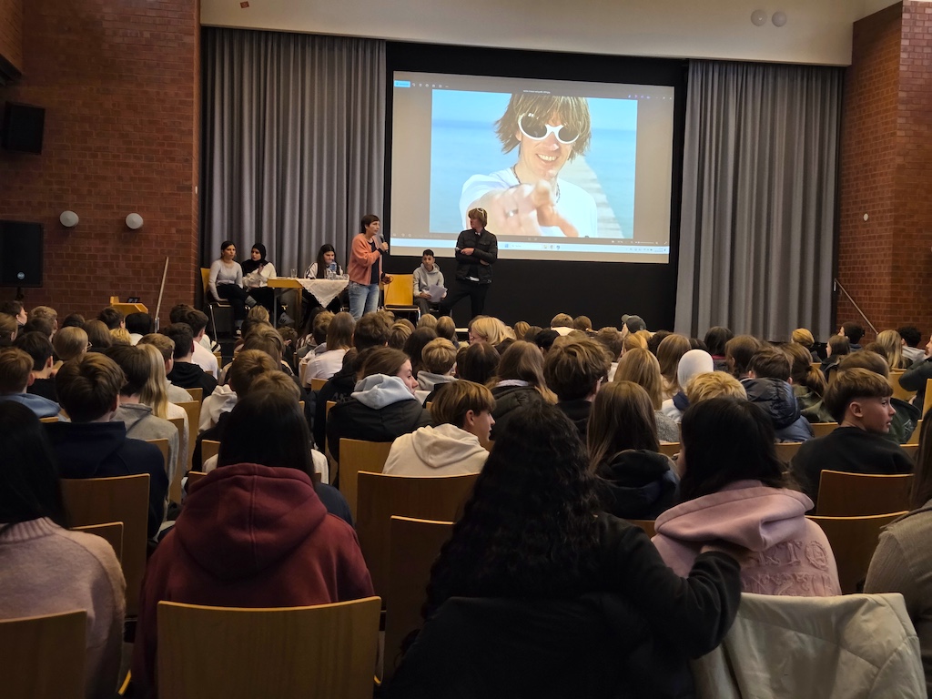 Ein zentraler Punkt seines Besuchs war die Unterstützung der Stiftung „Fly and Help“, die sich für den Bau von Schulen in Ländern wie Ruanda, Kenia und Namibia einsetzt. Die SV-SchülerInnen hatten viele Fragen vorbereitet, die er ausführlich beantwortete. Micky Krause betonte die Bedeutung von Bildung und wie sie das Leben von Kindern und Jugendlichen verändern kann. Und wie ist er selbst dazu gekommen, mitzuhelfen Schulen zu bauen? 2018 lernte er die Stiftung im Rahmen einer Schlagerreise durch die Dominikanische Republik, bei der Spenden gesammelt wurden, kennen und war so begeistert, dass er selbst eine „Micky-Krause-Schule“ gründen wollte. Und seitdem engagiert er sich für die Stiftung. Bildung ist für ihn der Schlüssel, besonders in den Entwicklungsländern, doch gerade dort sind die Schulen oft weit entfernt nur in den größeren Städten und für viele Kinder somit kaum erreichbar. Deshalb sammelt er Spenden für Schulen in kleineren Dörfern. „Seine“ erste Schule wurde übrigens tatsächlich ein Jahr später in Ruanda eröffnet. Noch heute ist dieser Moment, als die 400 Schülerinnen und Schüler für ihn Spalier standen und er ihre Dankbarkeit spürte, für ihn einer der emotionalsten Momente seines Lebens.