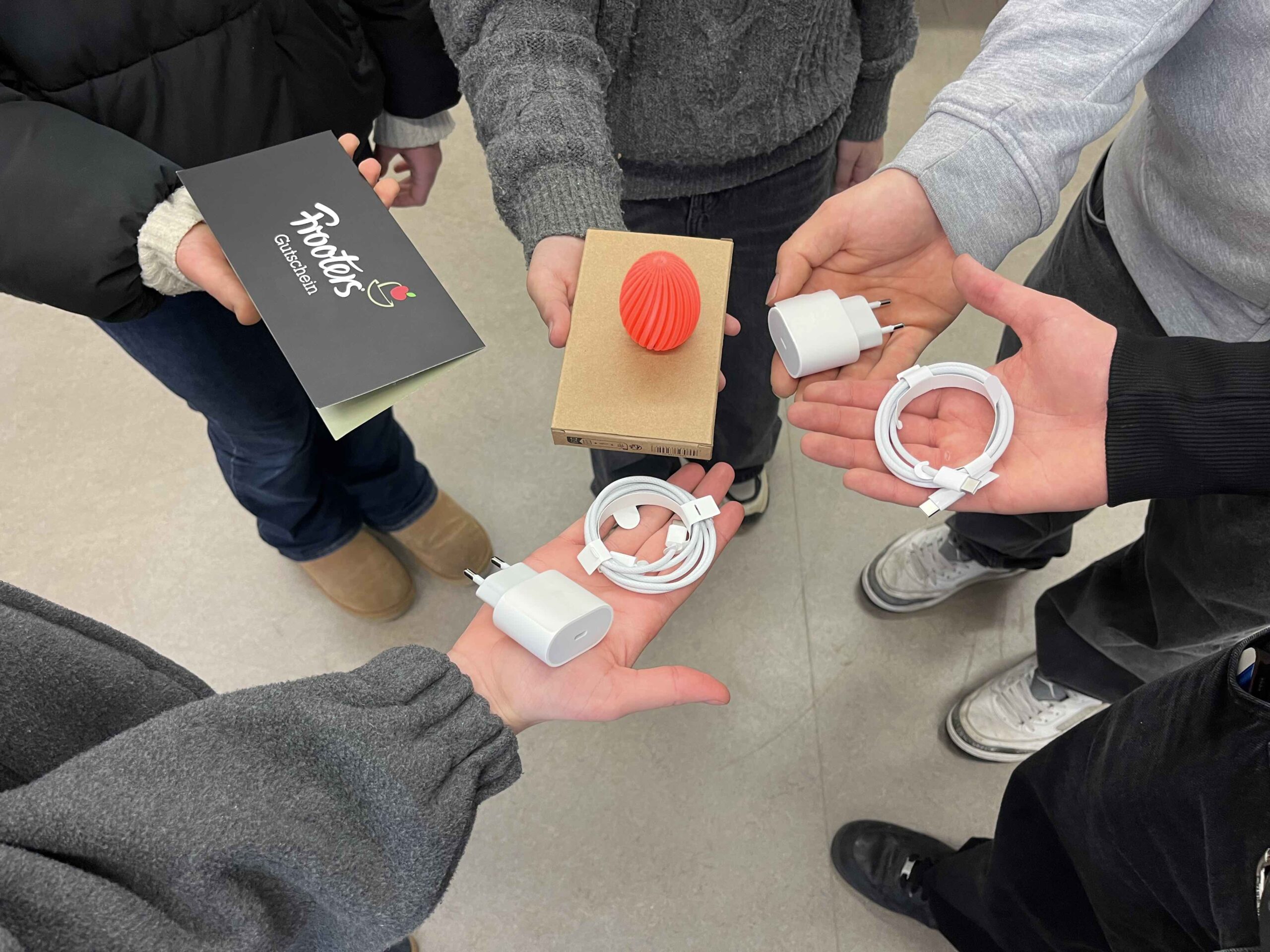 Auf dem gesamten Schulgelände – außer in den Unterrichtsräumen, werden wir von Mittwoch bis Freitag zwölf besondere Eier verstecken. Jedes Ei enthält einen Gewinncode, hinter dem sich tolle Überraschungen verbergen – von Gutscheinen über Powerbanks bis hin USB-C-Ladekabeln mit Netzadapter und vielem mehr.